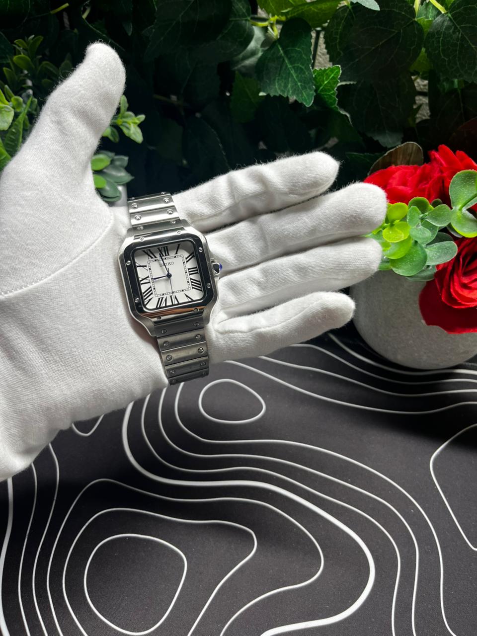 Introducing the Seiko Mod Santos Classic, a custom Seiko NH35 Automatic Watch inspired by the iconic “Santos” design. This piece combines elegance and precision, featuring a White Roman aftermarket dial encased in a 38mm stainless steel frame. The transparent back piece allows a glimpse into the intricate automatic movement, making it a standout choice for watch aficionados.